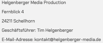 Die durch die Seitenbetreiber erstellten Inhalte und Werke auf diesen Seiten unterliegen dem deutschen Urheberrecht. Die Vervielfältigung, Änderung, Verbreitung, Darstellung, Veröffentlichung, Verkauf, Bearbeitung, Verfremdung oder Nutzung von Informationen oder Daten, insbesondere die Verwendung von Texten oder Bildmaterial, bedarf der vorherigen schriftlichen Zustimmung durch Helgenberger Media Production.